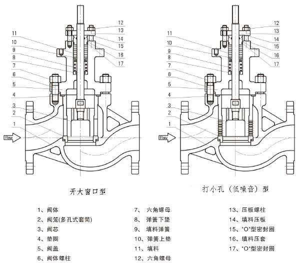采用套筒壓力平衡結構,在閥芯上設壓力平衡孔,有效消除作用在閥芯上下部分的軸向不平衡力。其由閥體,套筒,閥芯,閥桿,上閥蓋,密封墊片,填料等零件組成。
